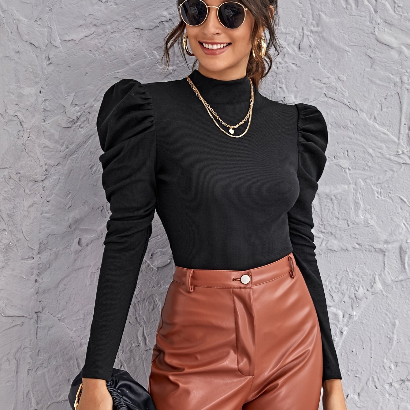 TEMU 여성 우아한 폴리에스터 터틀넥 퍼프 슬리브 티셔츠, 단색, 일반 길이, 긴팔, 올 시즌 패션 상의