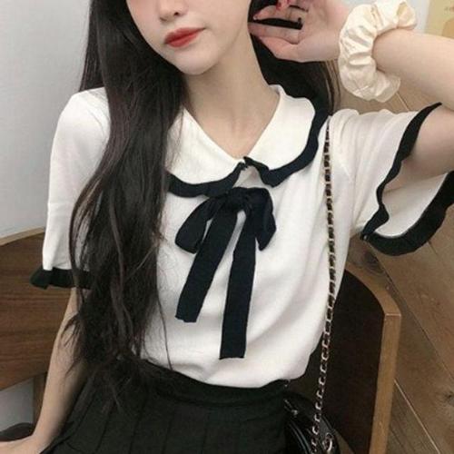 반팔티 리본 무지 카라 라운드티셔츠 면티 여성