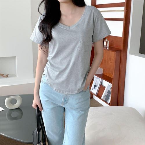 라운드티셔츠 기본 브이넥 여성반팔티 포켓 여자
