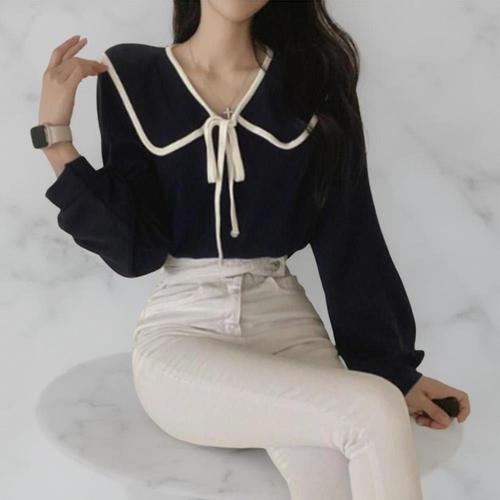 [옷자락]여성 러블리 배색 세일러 카라 리본 블라우스