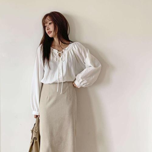 [옷자락]여성 러블리 단색 스트랩 셔링 블라우스