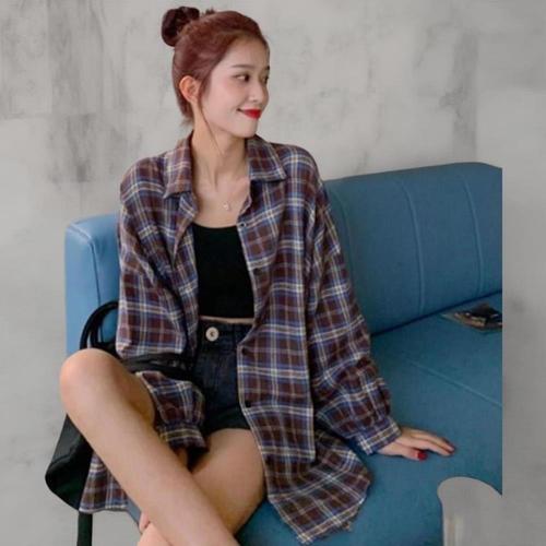 바이일이오 여성 사계절 체크 긴팔 오버핏 루즈핏 셔츠