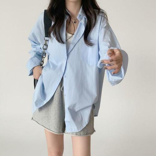 [신상오픈런]여성용 파스텔 컬러 오버사이즈 긴팔 셔츠 봄 여름 데일리 스타일