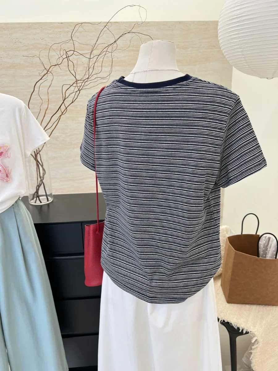 플러스 사이즈 여성 여름 스트라이프 자수 반팔 티셔츠 디자인 센세이션 니치 유니크 정교한 탑 한국 스타일 루즈핏