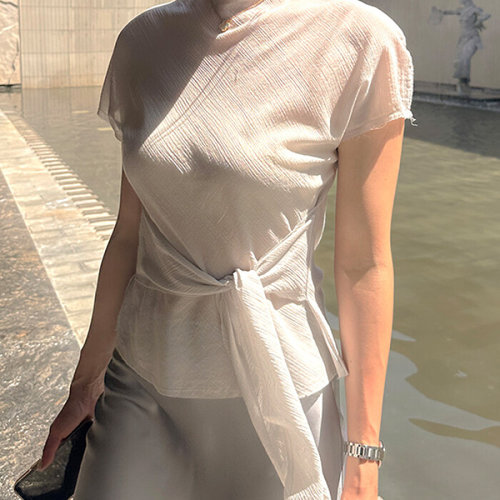 더클립 / 베일라 하이넥 허리 스트랩 시스루 블라우스