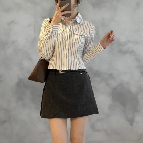 [옷자락]여성 긱시크 허리 조절 크롭 스트라이프 두 개 포켓 셔츠