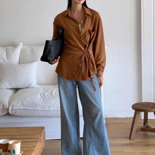 |KDH4126|여성 무지컬러 원포켓 허리 스트랩 크로스 셔츠 블라우스