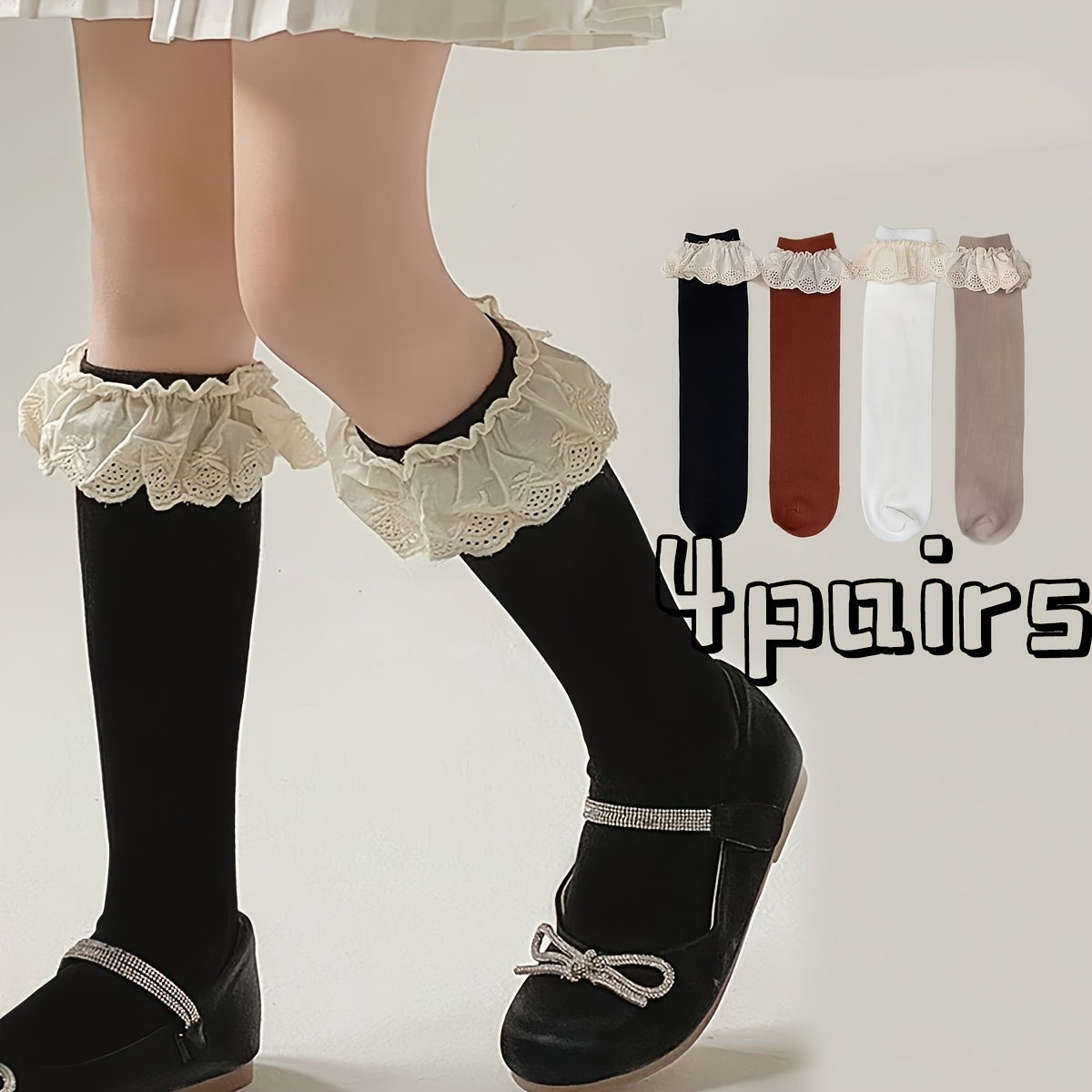 TEMU 귀여운 여아 레이스 장식 긴 양말 4켤레 | 엘라스테인 혼방, 학교 유니폼 및 드레스에 적합, 사계절 내내 편안함
