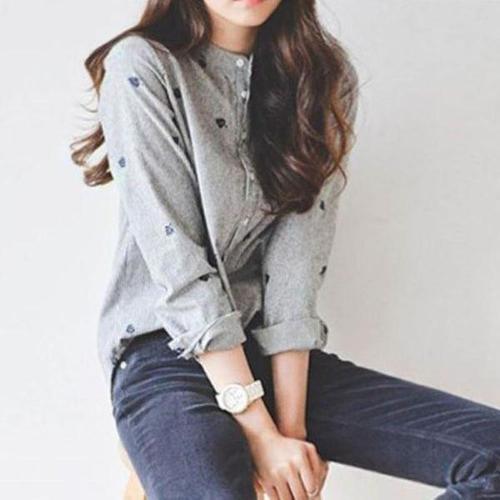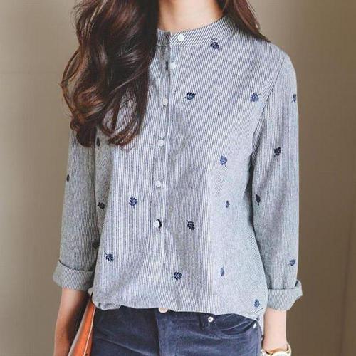 [신상오픈런]여성 독특한 잎무늬 자수 차이나 카라 스트라이프 셔츠