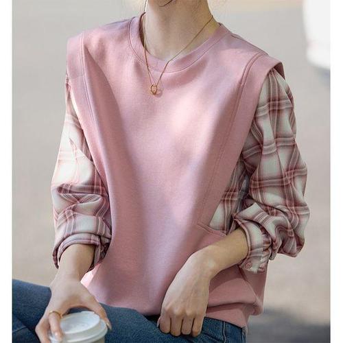 [패션시그널]체크슬리브레이어드 맨투맨 D07062
