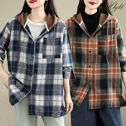 [헬리꽁땡](55~88)2종세트 글로리체크후드셔츠 롱셔츠 오버핏 여성블라우스 롱티 박스티 여성긴팔셔츠 여..
