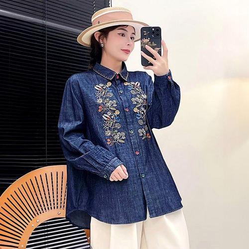 [헬리꽁땡](55~88)프리미엄 데님 플라워자수 셔츠 자켓 청남방 롱셔츠 여성봄블라우스 롱티 박스티 여성..