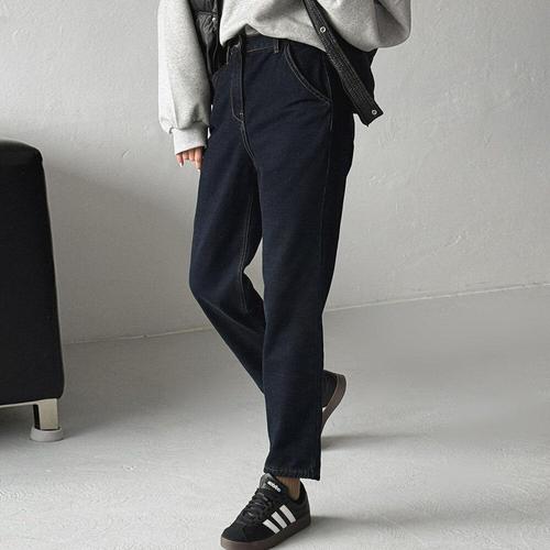 여성 배기진 진한색 기모 데님 슬림핏 스티치 면바지