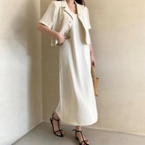 |CCD28A7|여성용 봄 여름 루즈핏 코튼 블레이저와 롱 원피스 세트