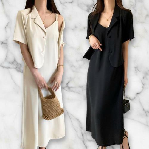 |CCD28A7|여성용 봄 여름 루즈핏 면 블레이저 긴 원피스 세트