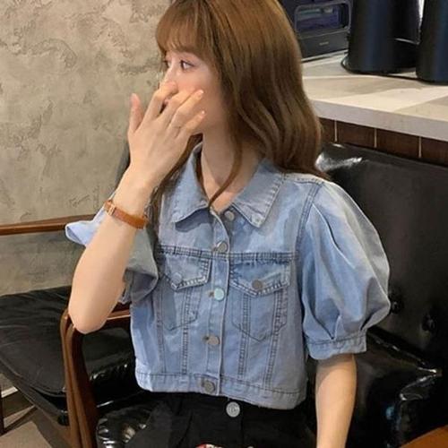 여성 여름 반팔 벌룬소매 데님 숏자켓 카라청크롭자켓