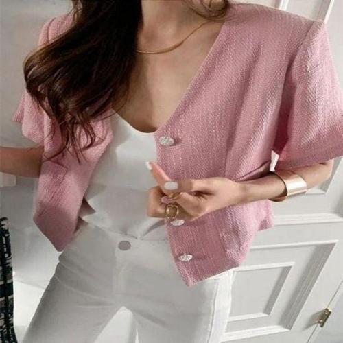 샵앤) 여성 V넥 단추 오픈 심플 데일리 여름 반팔 자켓 BONG-WJK-4520-아이보리