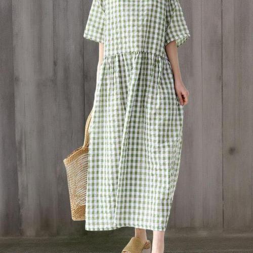 [신상오픈런]여성 루즈핏 체크 패턴 면혼합 반팔 롱 드레스