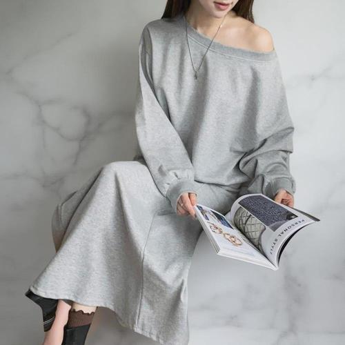 [옷자락] 여성 루즈핏 오프숄더 맨투맨과 트임 롱 스커트 세트