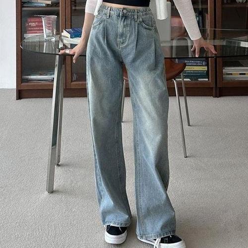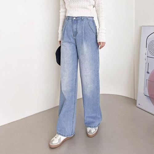 [에이치플러스몰]여자 핀턱 와이드 데님 본 가을 연청청바지