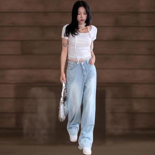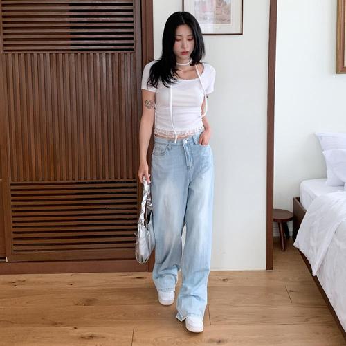 [신상오픈런]여성용 연청 세미와이드 롱 데님팬츠