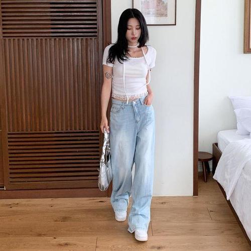[옷자락]여자 구제 페인팅 컷팅 속밴딩 연청 와이드 청바지