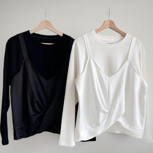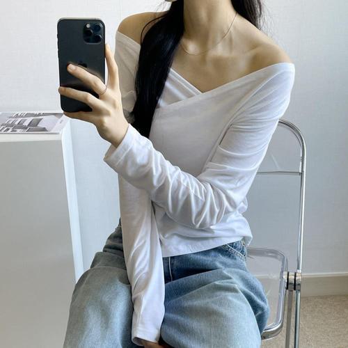 |CST99FF|여성 레이어드 랩 오프숄더 긴팔 크롭 티셔츠 옆트임