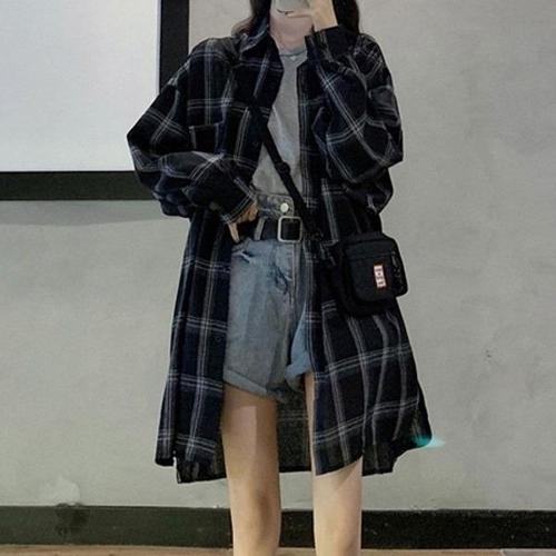 [신상오픈런]체크 셔츠원피스 순면 얇은긴팔 옆트임 긱시크