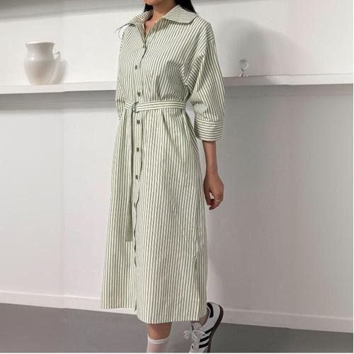 [신상오픈런]셔츠원피스 벨티드 옆트임 셔켓 스트라이프 칠부소매