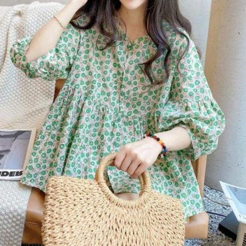 [에이치플러스몰]여성 여름 플라워 루즈핏 예쁜 면 마 블라우스