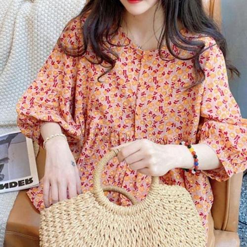[에이치플러스몰]여성 여름 플라워 루즈핏 예쁜 면 마 블라우스 오렌지
