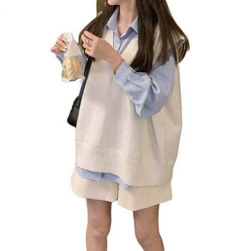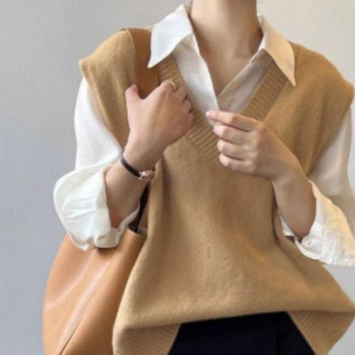 샵앤) 여성 간절기 배색 V넥 오버핏 레이어드 니트 조끼 BONG-WVS-4113-아이보리