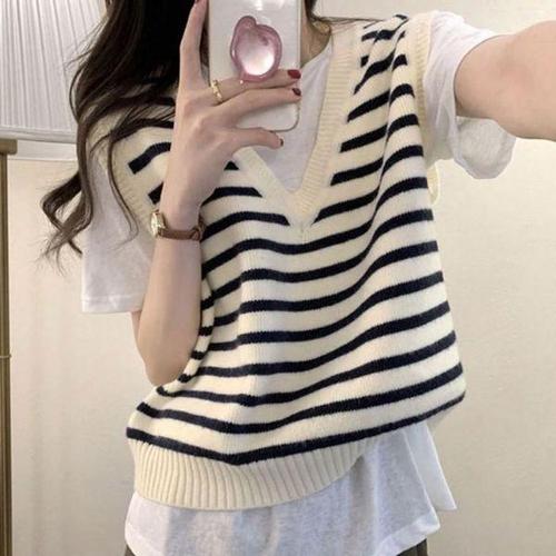 [에이치플러스몰]패션 스트라이프 여자 브이넥 조끼 데일리 베스트 오버핏조끼 남성니트조끼 브이넥 가을..