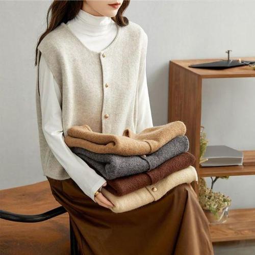 [에이치플러스몰]여자 루즈핏 니트조끼 브이넥 단추조끼 가을 레이어드 베스트 가디건 니트조끼 베이지베..