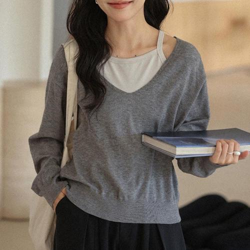 [옷자락] 여자 봄 가을 데일리 루즈핏 레이어드 브이넥 니트