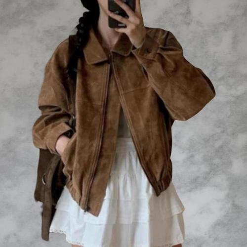 2025년 봄 신상 여성 스웨이드 질감 효과 루즈핏 패션 라펠 숄더 보머 재킷