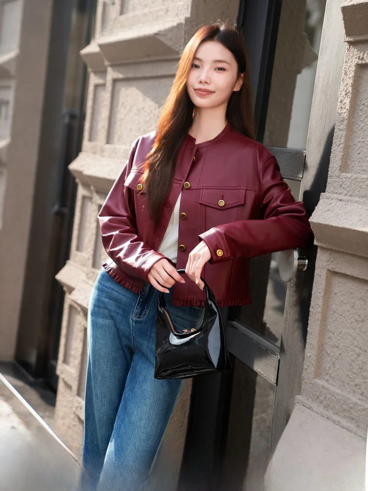 Women Clothes Turn-Down Collar Single-Row Buckle Suit Style Suede Sheepskin Luxurious Leather Jacket Green Loose