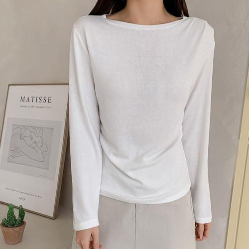 [하프클럽/옷자락]여자 어깨 셔링 보트넥 무채색 데일리룩 긴팔 티셔츠