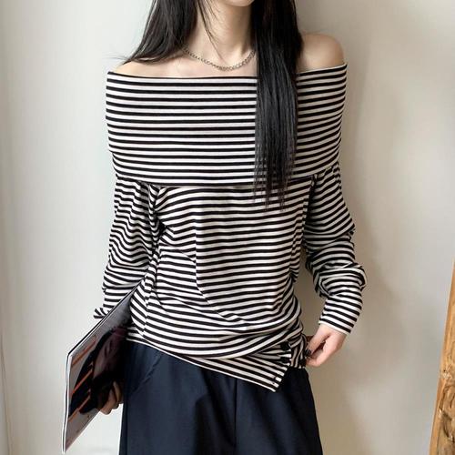 [옷자락] 여자 베이직 스트라이프 오프숄더 루즈핏 긴팔티