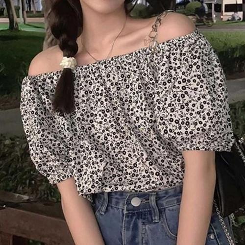 여성잔꽃 무늬 오프숄더 퍼프 반팔 블라우스