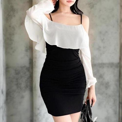 [옷자락]여성 시크룩 쉬폰 컬러블록 오프숄더 셔링 미니 드레스
