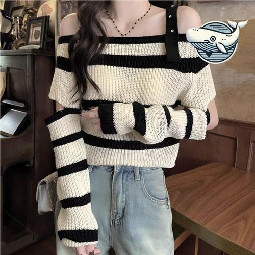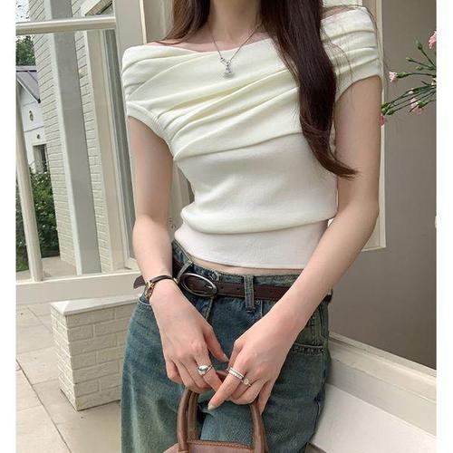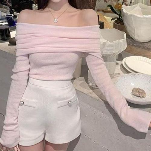 [에이치플러스몰]유니크 스타일리쉬 여성 오프숄더 크롭 니트 티셔츠