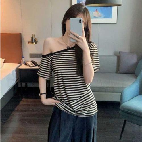 [에이치플러스몰]스트라이프 인기 오프숄더 티셔츠 여름 감성 여성 캐