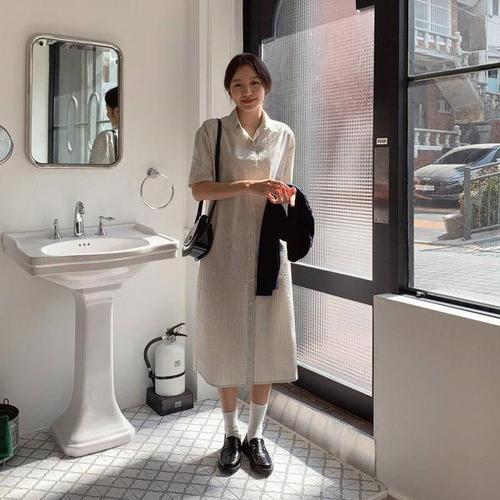 [신상오픈런]여성용 스트라이프 여유핏 반팔 카라 셔츠 롱 드레스