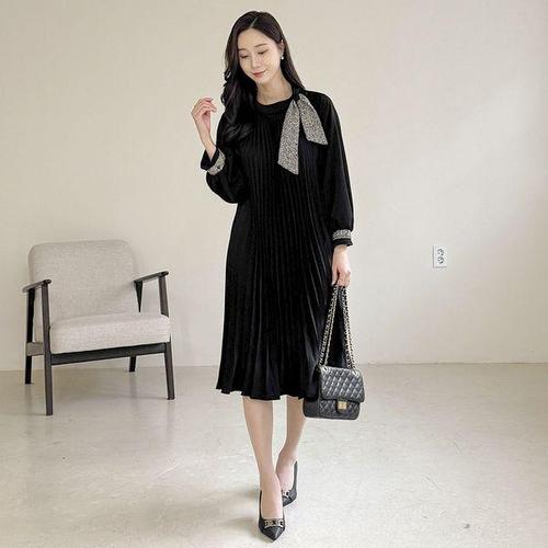 [드리다]리본 타이 빅사이즈 A라인 플리츠 원피스 하객 상견례 오피스룩