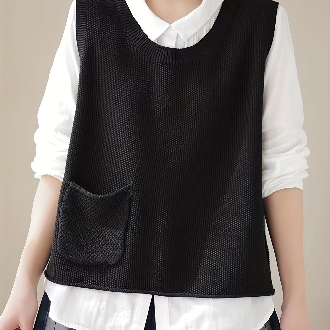 TEMU 여성용 캐주얼 니트 베스트, 포켓이 있는 단색 폴리에스테르 크루 넥 슬리브리스 풀오버 스웨터, 봄/가을/겨울용 - 400g/m² 니트 소재