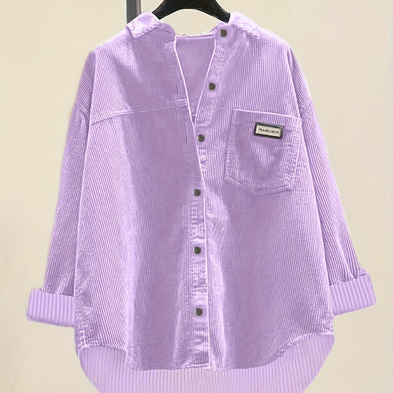 TEMU 여성용 연보라색 V넥 버튼업 셔츠 - 캐주얼 루즈핏, 가슴 포켓, 긴 소매, 리브드 질감, 캐주얼 의상에 완벽, 여성용 셔츠