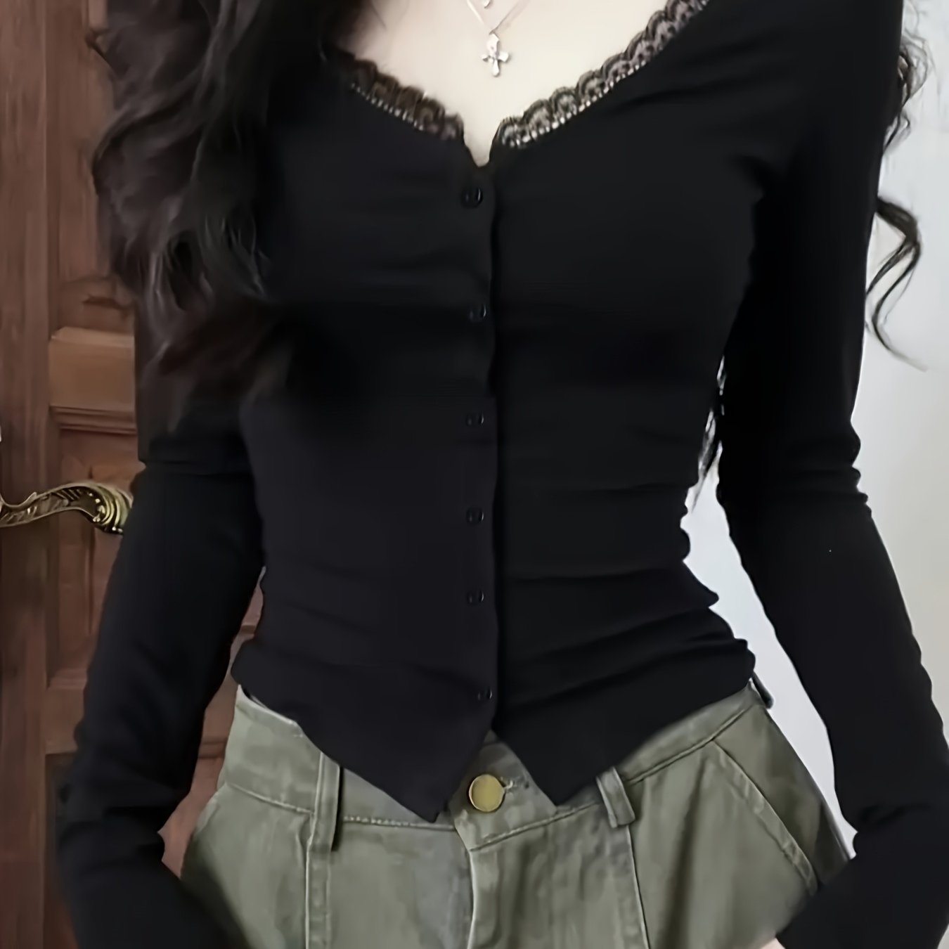 TEMU 여성용 슬림핏 V넥 긴팔 블라우스 - 대조 레이스 트림, 우아한 A라인 탑, 봄 여름 가을용, 다목적 레이어링 피스, 단색, 벨트 없음, 풀오버 스타일, 레이스 블라우스, 가디건, 여성원피스, 여성 상의