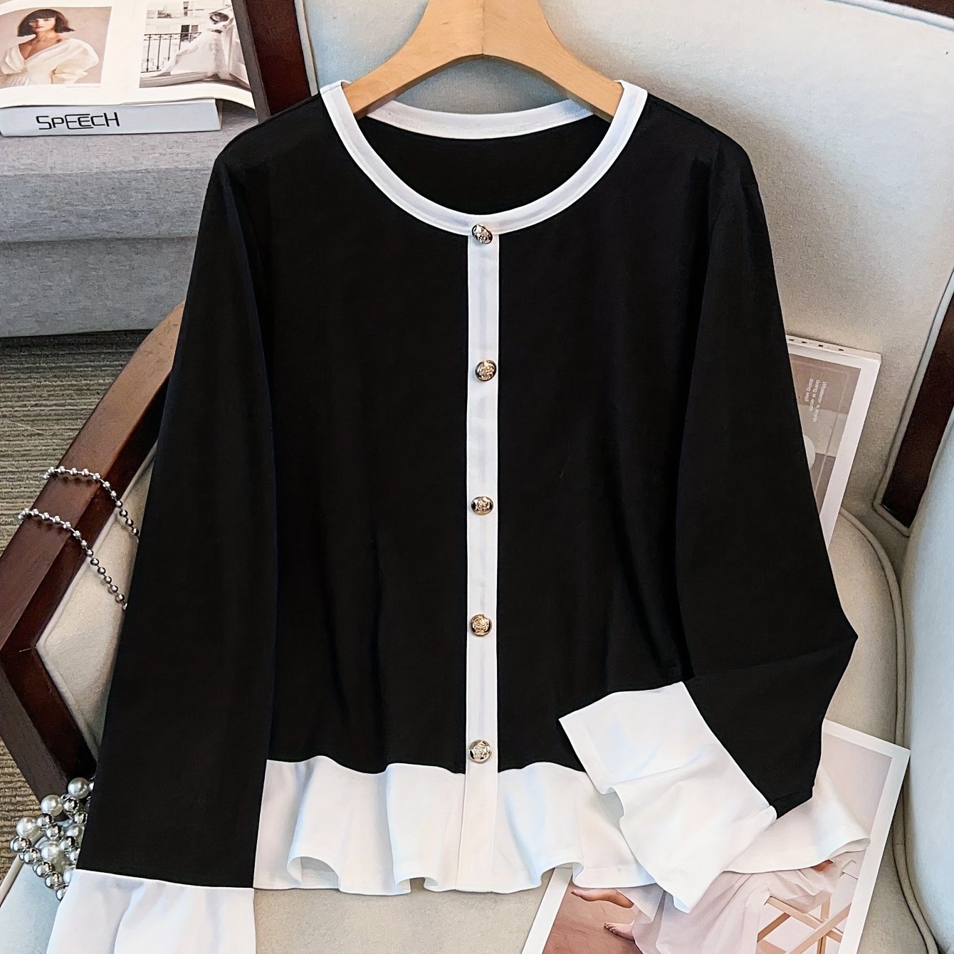 TEMU 플러스 사이즈 - 이 우아한 플러스 사이즈 여성용 캐주얼 긴팔 티셔츠는 러플 엣지, 라운드넥, 플레어 소매, 버튼 장식, 그리고 간편한 컷 디자인을 특징으로 합니다.