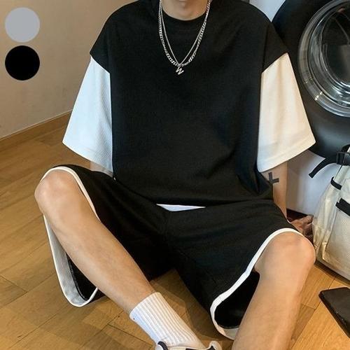 [엄지척]남자 배색 와플 반팔 레이어드 반바지 트레이닝복세트_20429561_667501